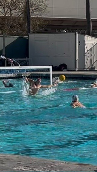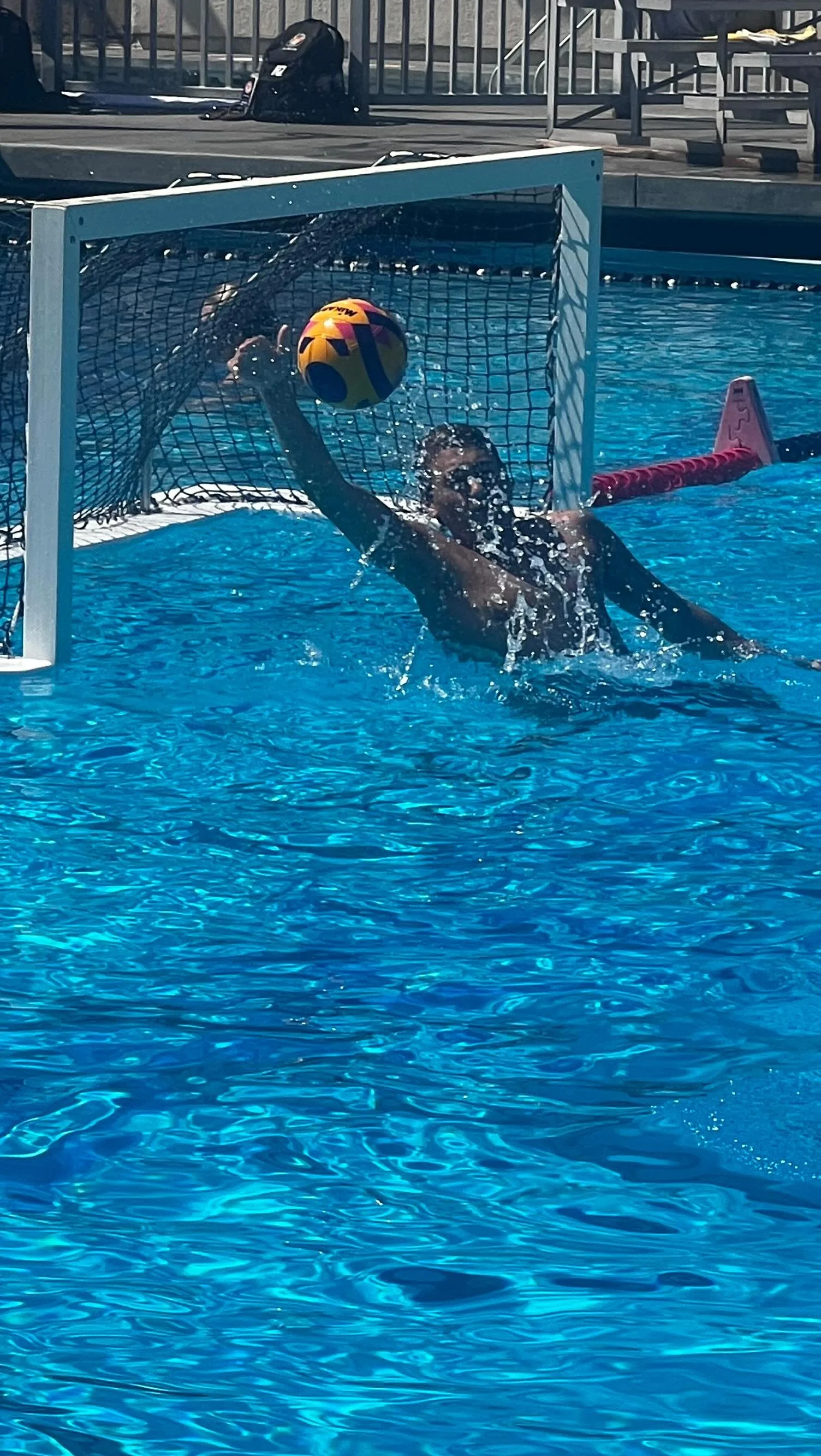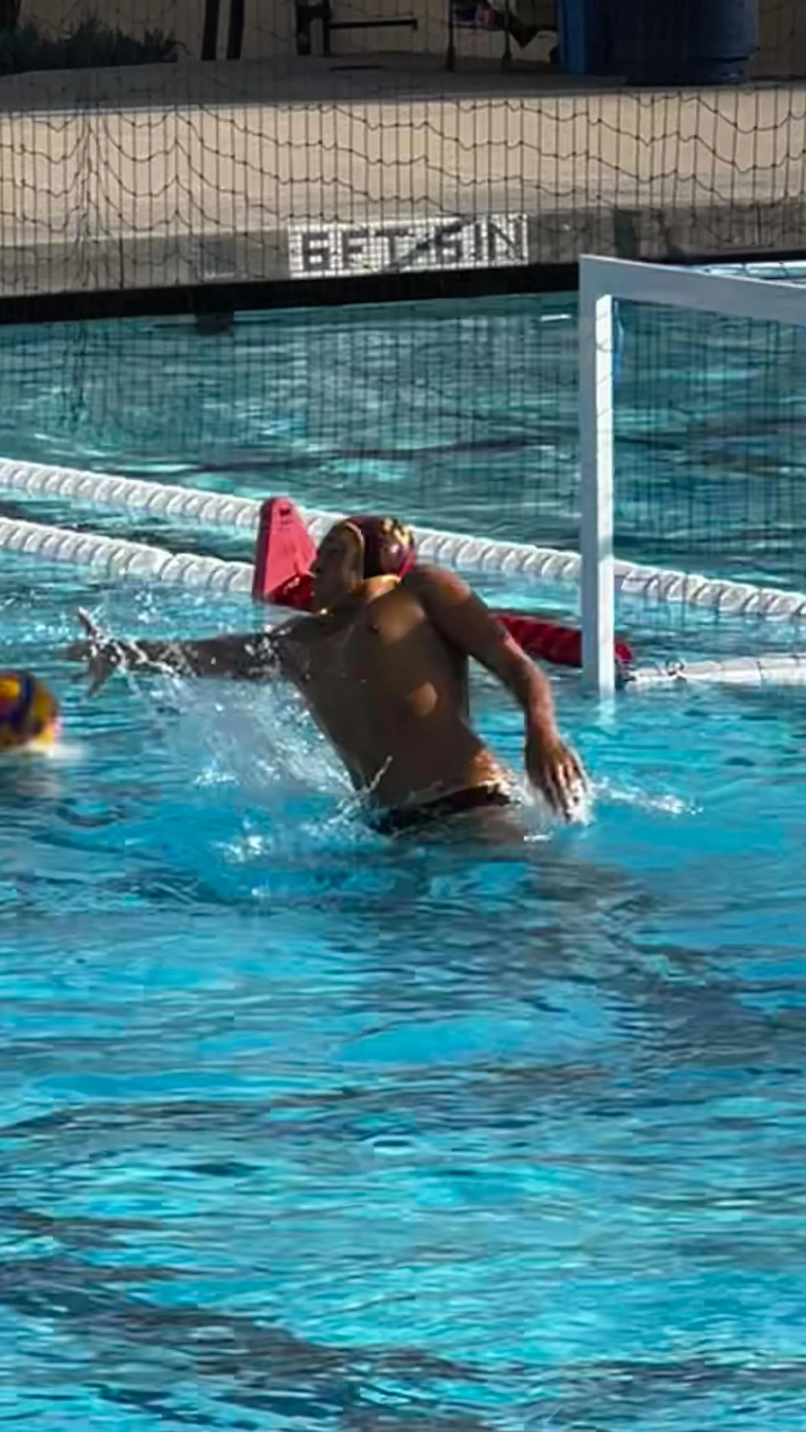 A water polo player wearing a red cap with the number 1 and the word 'SPAIN', touching the goalpost while in the water during a game.